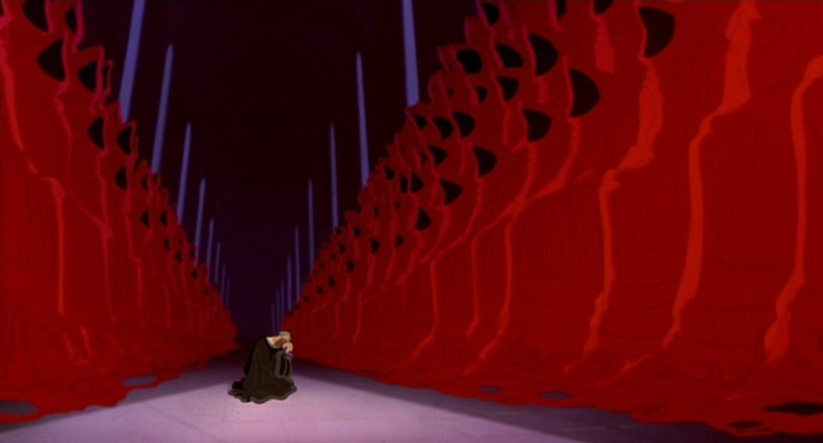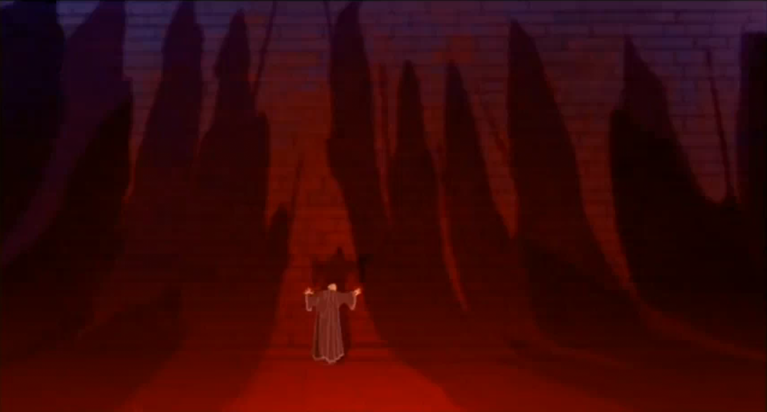 The animation during “Heaven’s Light” and “Hellfire” is undoubtedly the highlight of the film for me. It showed the ultimate contrast between a man who fell in love and a monster born from lustful desires. During Quasimodo’s song, the animation matched its simplicity and purity with soft moonshine and subtle shades of night blue. Its shift down to where Frollo stood before his fire came through excerpts from the Confiteor prayer {Or the prayer of Confession}, sung by the archdeacon and his monks. Their powerful words translated “I confess to God Almighty, To blessed virgin Mary ever virgin, To the blessed archangel Michael, To the holy saints apostles, to all the saints” brought the audience down from Quasimodo’s hopeful prayer to Frollo’s confession to the Virgin Mary.