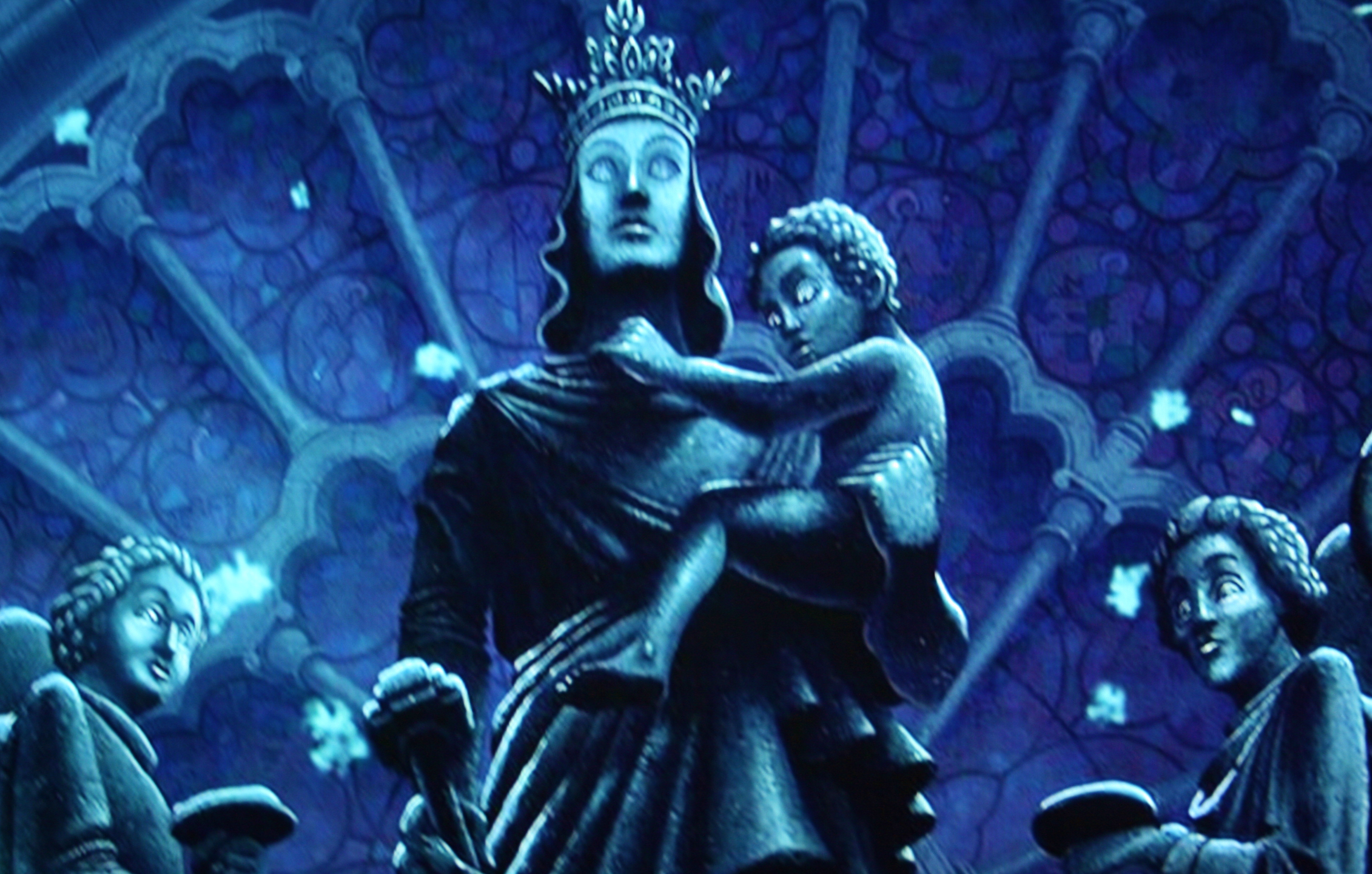 Like in the original novel, Notre Dame herself served as the most complicated character. Through gorgeous animation, she towered over the city, encircled by the river Seine as a symbol of God and freedom. The bells, the voice of Notre Dame, sang in chimes as witness to the the events surrounding all the characters. She served as judge to Frollo’s cruelty, as Quasimodo’s life long companion, and as Esmeralda’s sanctuary. Her presence, enhanced by the archdeacon’s haunting words “You can lie to yourself and your minions, you can claim that you haven’t a qualm, but you never can run from nor hide what you’ve done from the eyes! The very eyes of Notre Dame!” stopped Frollo from killing Quasimodo, and Frollo for the first time “felt a twinge of fear for his immortal soul” under the gaze of the stone apostles and saints.  During Esmeralda’s execution, almost as God’s surrogate, she chimed and shook as Quasimodo tore apart his chains, her features heightened almost in anger by the fires and smoke below.  In the end, Chopin sang Notre Dame’s final words, almost as her representative, “Now here is a riddle to guess if you can, sing the bells of Notre Dame: What makes a monster and what makes a man?”.
