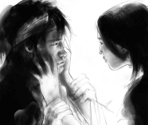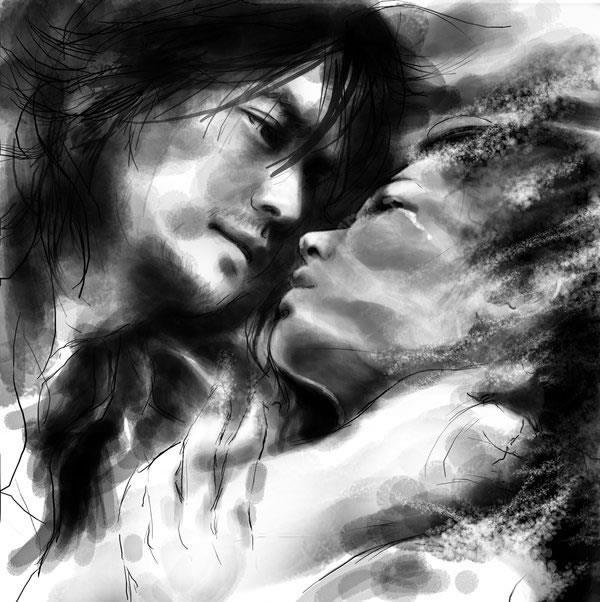 Back to the artist. Most of her works are in black and white and feature samurai or lovers. She has done some works for Western audiences including The Hobbit but, from what I can see, tends to focus on Japanese or Chinese historical figures.