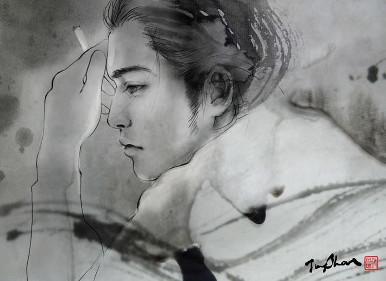 (Thank you once again Musetouch Magazine!) Finally, I found an artist outside of Europe and Japan that I like. Jung Shan comes from Taiwan and works as a general office clerk for a technology company. She does a variety of illustrations, combining Chinese watercolor styles and Western drawing techniques. She has also traveled throughout the world to countries like Spain, German, France, Poland, the UK and China. I find her quite interesting because she loves the idea of taking an ancient tradition and giving it a modern flare. She has no qualms about using digital tools to modify her works. If you are interested in reading an interview with the artist you can look up this link—–> JAPAN CINEMA.