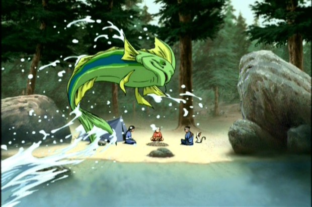 Sokka: Smoochee smoochee. Someone’s in love. [screams as the fish hits him in the face.]
