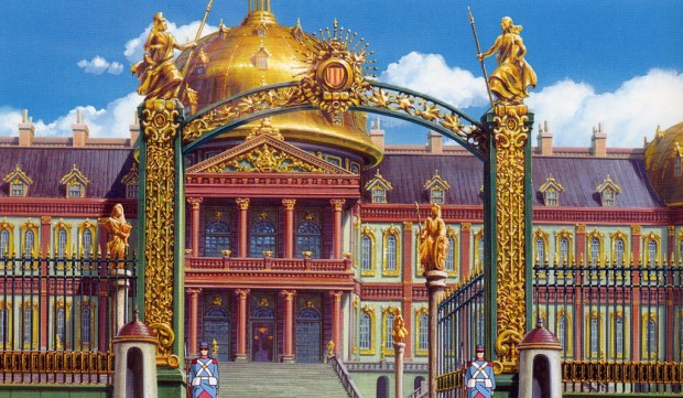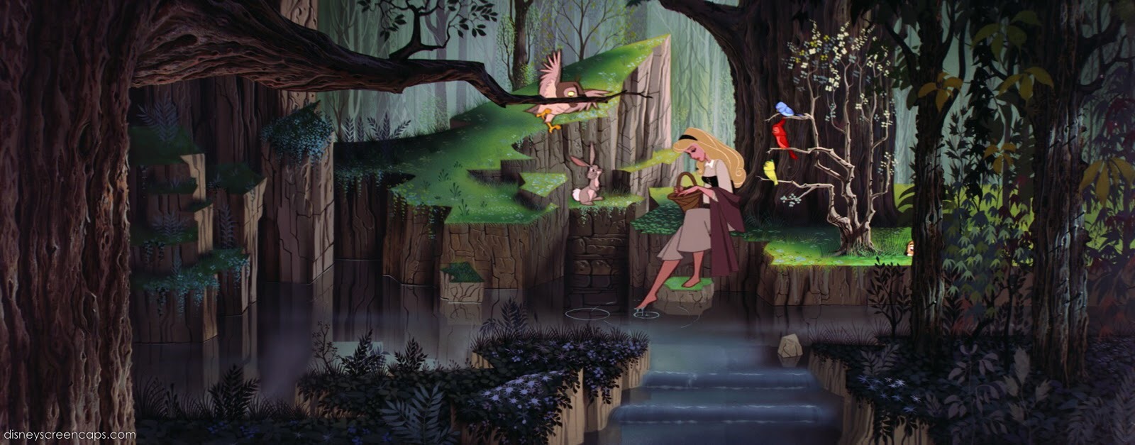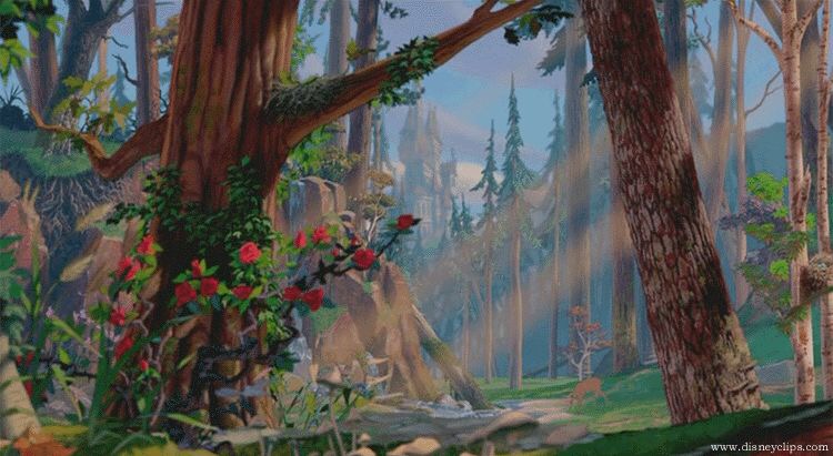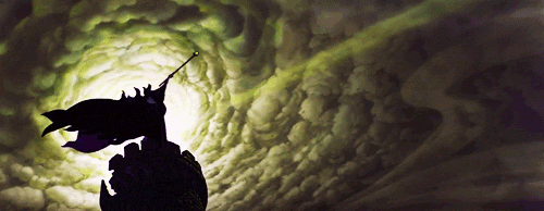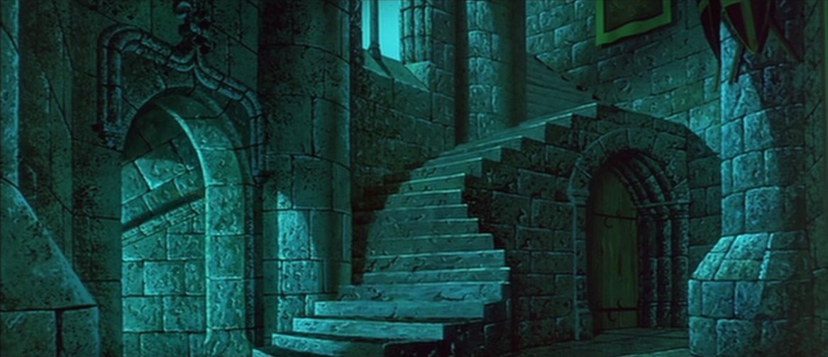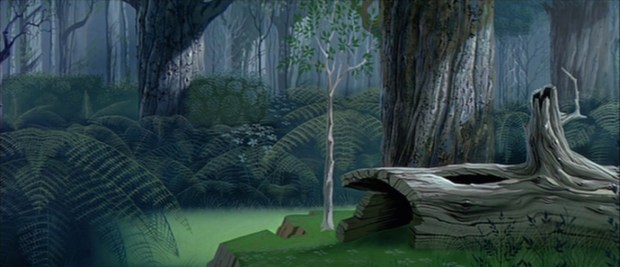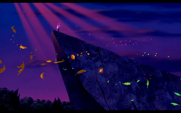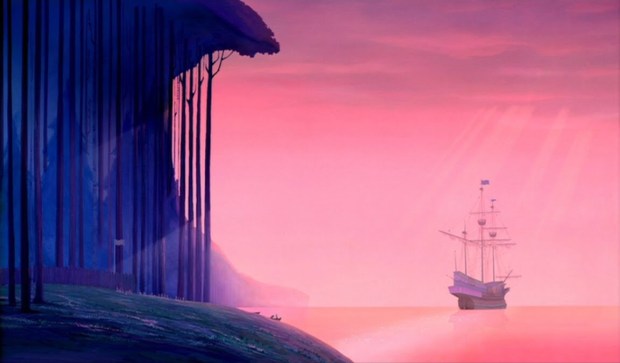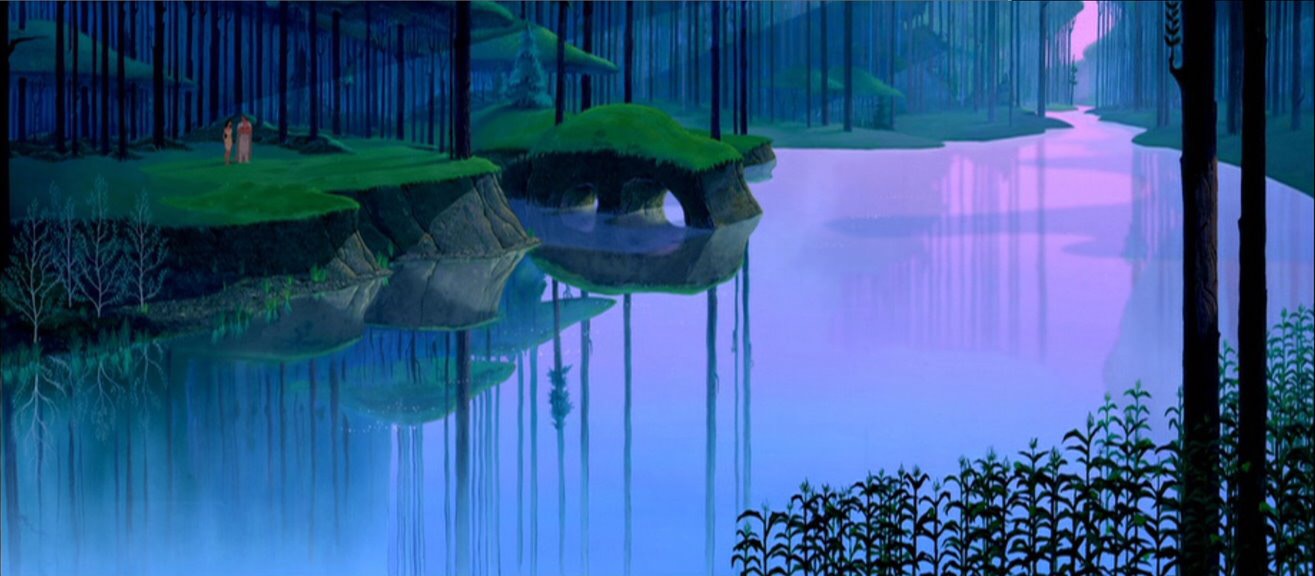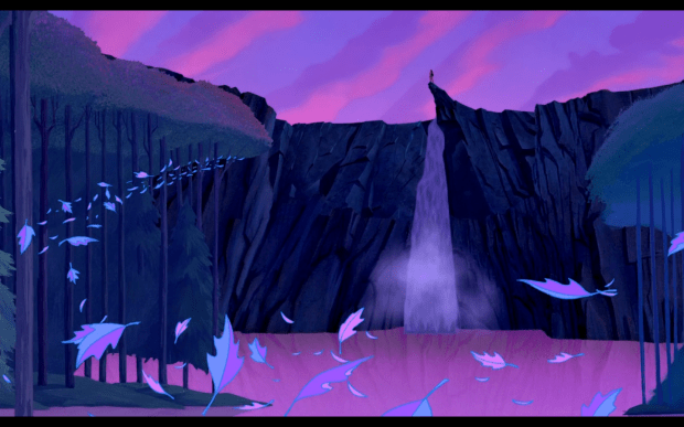 Because I hated the story, I ignored how beautifully crafted its visuals are. As a kid I must have noticed, for when I was seventeen I commented to my mother that I had forgotten how magical this film was. Magical in what way exactly? Well, its styles, colors and visual execution are breathtaking. Stop, and take a moment to look at the images I found. I did not have to do a lot of digging to find these. Every background is absolutely gorgeous and bursting with the colors blue, purple and pink.