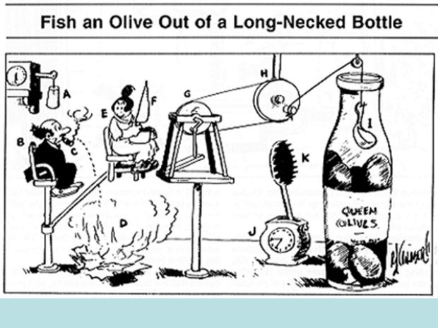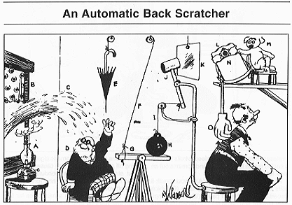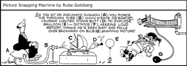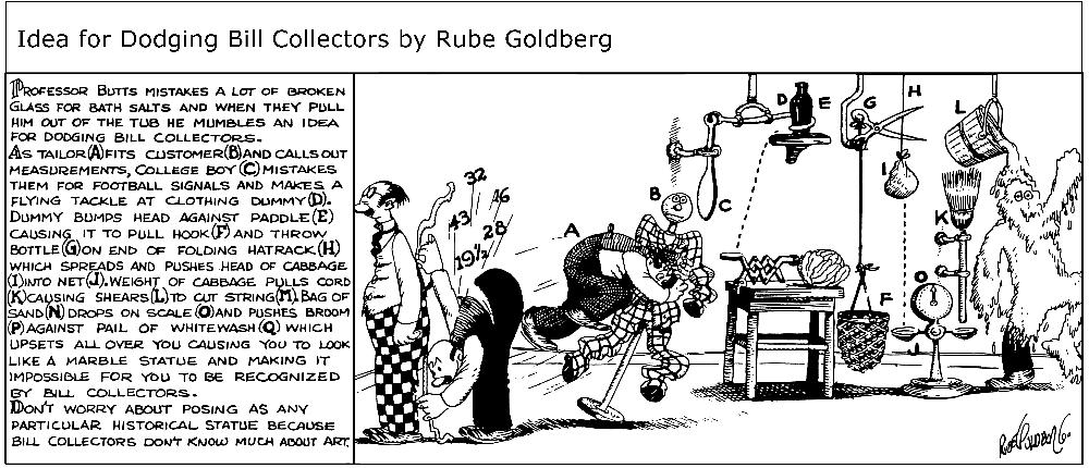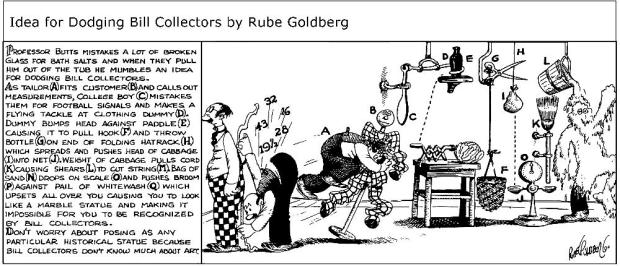{Fun Fact! The gags used in their home were done in what is called The Rube Goldberg style where a highly complicated mechanism or invention is used to do simple everyday tasks. This term adheres to the famous caroonist Rube Goldberg, who drew throughout the early Twentieth Century. }