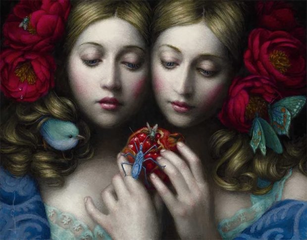 I also enjoy her use of color throughout her works, especially the not so subtle crimson red and deep blue which pop up throughout her gallery of paintings. Other common themes include butterflies, masks, dark backgrounds, birds, and famous greek deities. Overall, her style is a warm mixture of Western and Eastern art styles. Feel free to explore her artworks and biography on her WEBSITE!