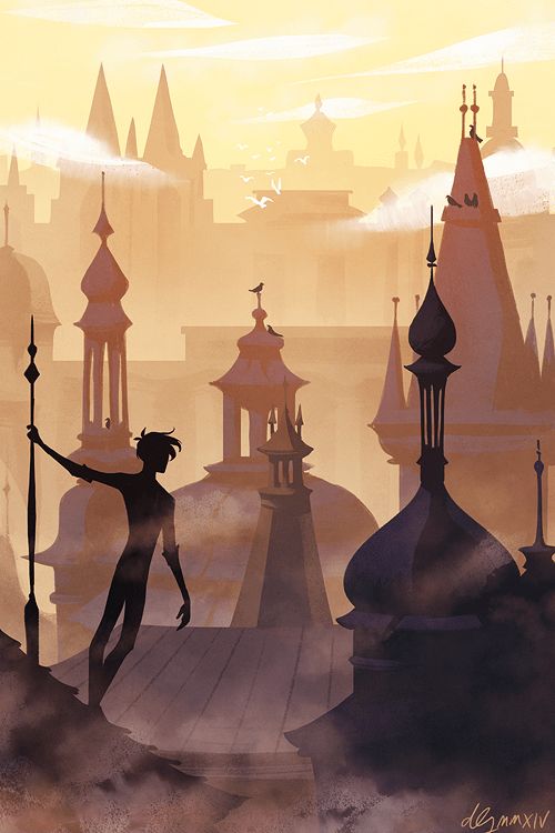 That aside, I didn’t think I’d enjoy this artwork so much, but I did. I like how it is made almost entirely by silhouettes building off each other. The highlight for me is the young man leaning off of a building steeple.