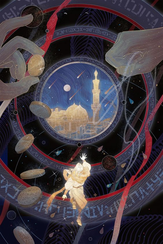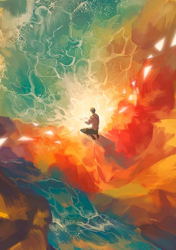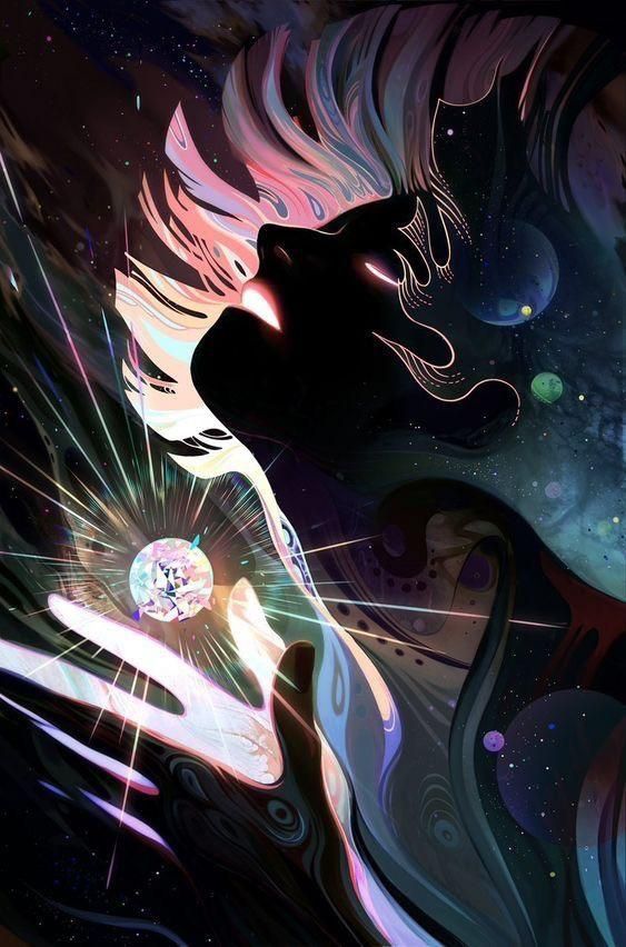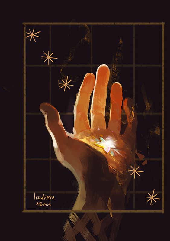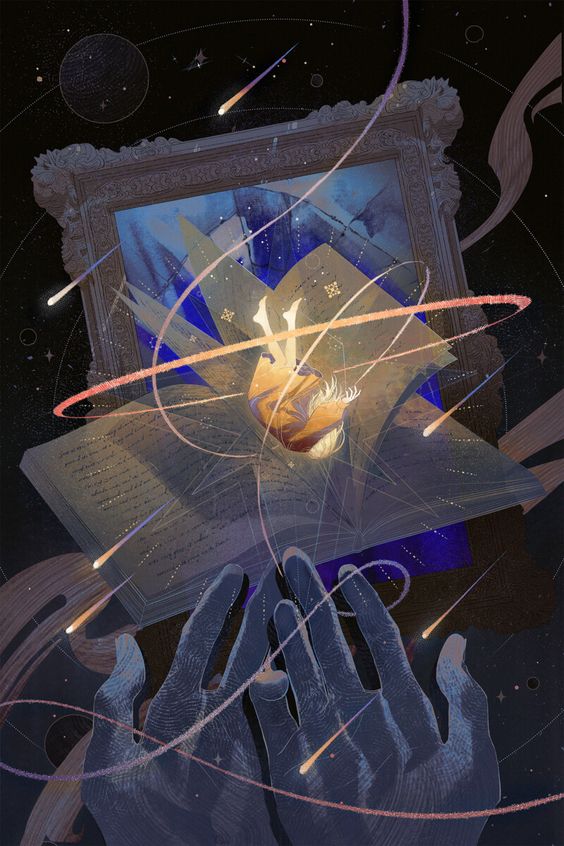 Another fantasy of mine is falling into a book. This artwork features some of my favorite aesthetics: hands, shooting light, an illuminated book, and space.