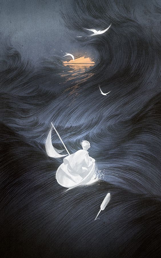 I love how the few colors she chose to feature on the cover work so well together, from the white on the boy and his boat, to the iridescent orange of the island surrounded by a grey sea, I think this artwork is beautiful and timeless.